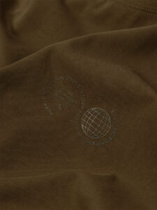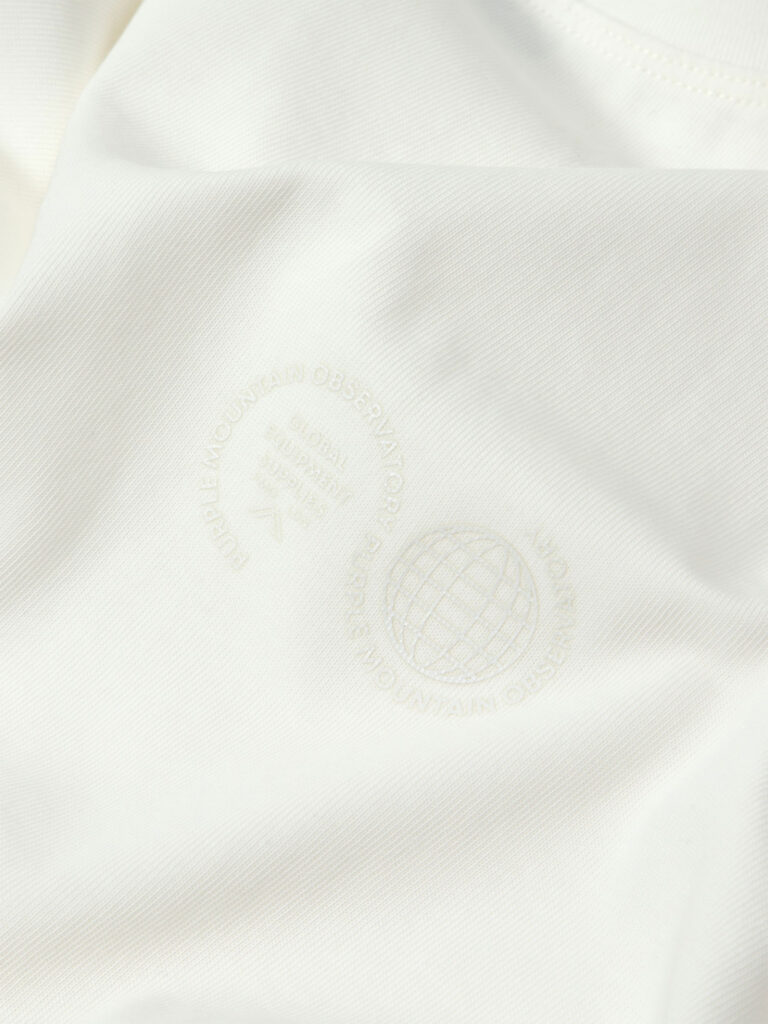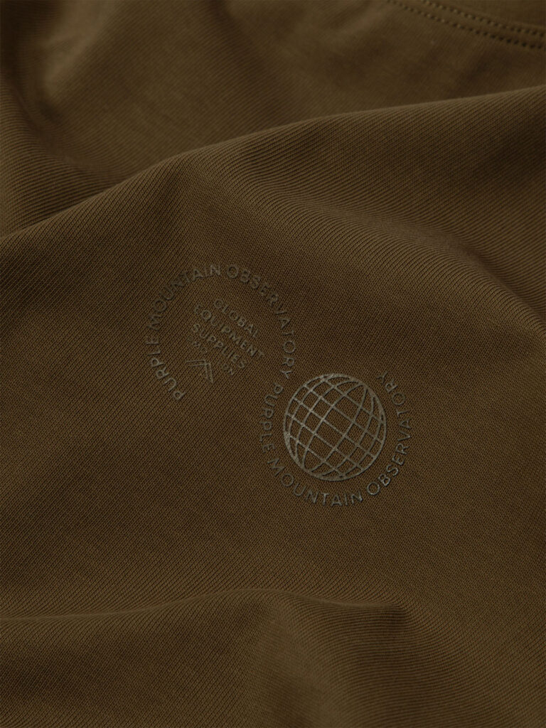 Дизайн футболки отличается лаконичностью и утончённостью. Тональный логотип Purple Mountain Observatory добавляет изысканности и подчёркивает принадлежность к премиальному сегменту. Этот элемент декора выполнен в тон основной ткани, что создаёт эффект сдержанной элегантности.