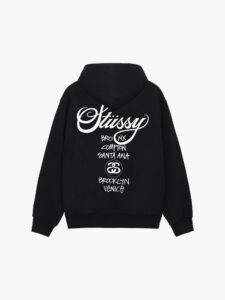 Толстовка Stussy World Tour Zip Hoodie Black — это воплощение уличного стиля и комфорта, которые стали визитной карточкой бренда Stussy. Основанный в 1980-х годах, этот бренд быстро завоевал популярность благодаря уникальному сочетанию уличной моды и калифорнийской культуры серфинга. Каждый элемент одежды от Stussy — это не просто вещь, а часть истории, которая продолжает развиваться и сегодня.